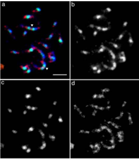 (c) 100 bp tandem repeat signals. (d) 74 bp tandem repeat signals. Bar is 5 µm.