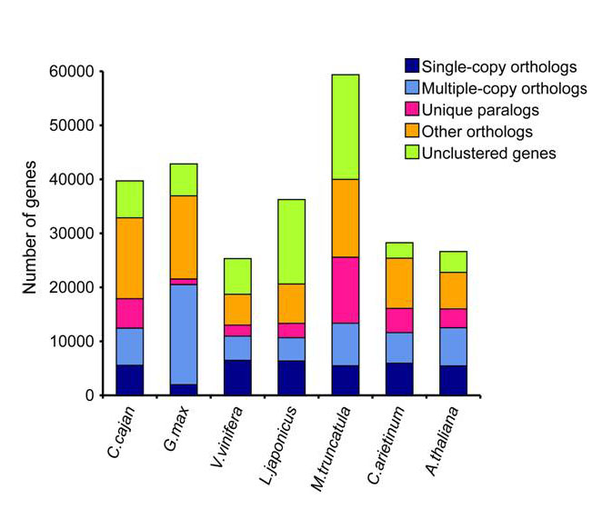 A comparative account of orthologs and paralogs genes in chickpea genome shown in comparison to genomes of four legume species (Medicago truncatula, Lotus japonicus, pigeonpea, and soybean) and two other plant species (Arabidopsis thaliana, and grape). |