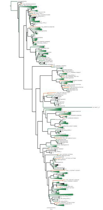 Monophyletic clades are collapsed into filled triangles, with numbers at the base of the triangle indicating the number of genes in the given clade. Green, Medicago truncatula; orange, clades with chickpea sequences for the assembled genome only; black, clades containing both sequences from the chickpea genome and NBS domains obtained by PCR. Dual numbers at the base of black clades indicate number of PCR/genome sequences, respectively.